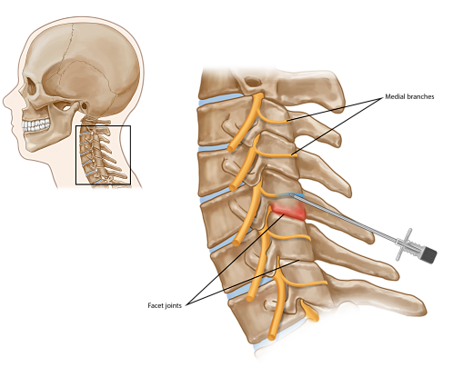 During this procedure, radio frequency energy is used to disrupt function of a cervical medial branch nerve, so that it can no longer transmit pain signals from an injured facet joint.